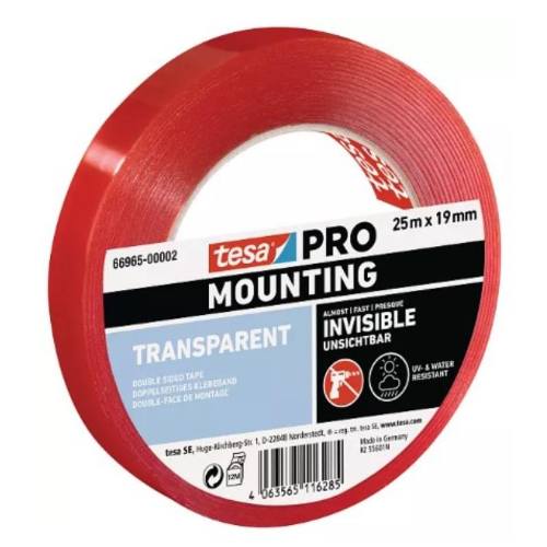 tesa PRO Mounting Transparent slouží k upevňování plochých objektů uvnitř i venku: Hodí se na nejrůznější povrchy – sklo, dlaždice, povrchově upravené dřevo či různé typy plastů. Dokonale průhledná a mimořádně tenká páska odolá teplotě až do 100 °C. Je odolná proti vlhkosti, některým chemikáliím, změkčovadlům a UV záření. Jediný pruh o délce 10 cm udrží až 2 kg. Jde o skvělé řešení, když potřebujete něco připevnit na průhledný pevný povrch.