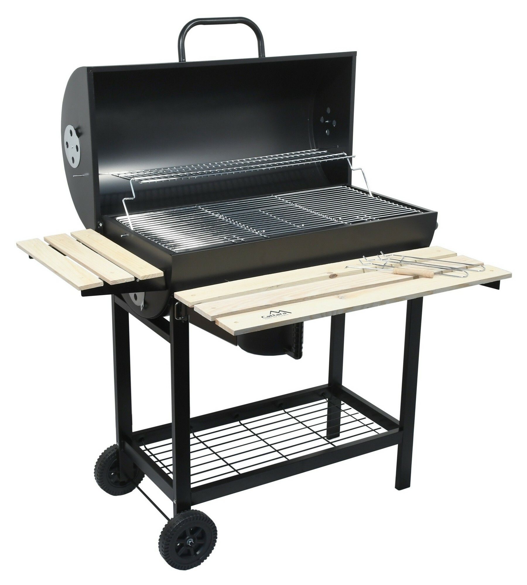 Velký zahradní gril na dřevěné uhlí, je vybaven víkem s vestavěným teploměrem, rozměrnou grilovací plochou a celou řadou odkládacích prostor.
