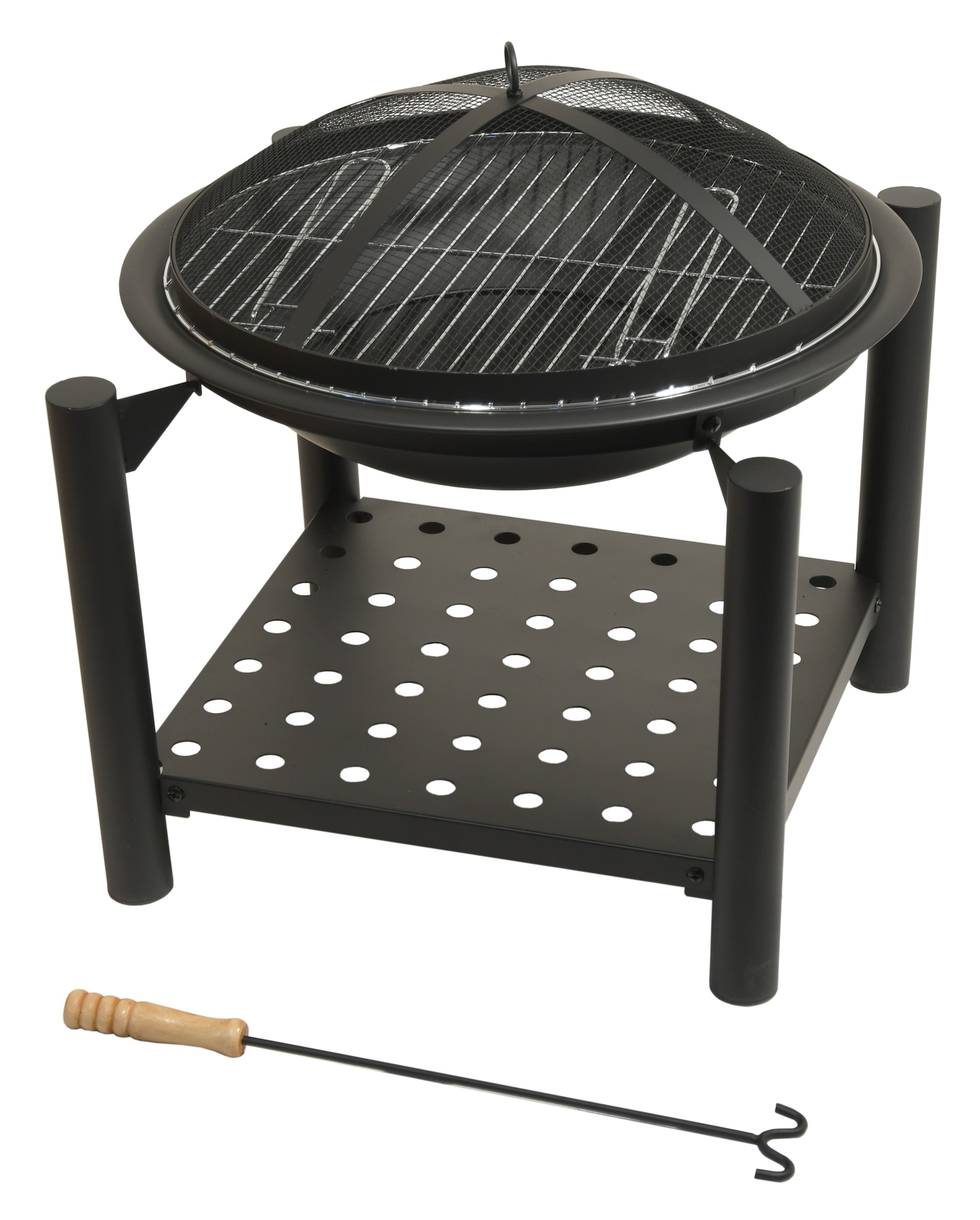 Speciálně tvarovaný poklop s pletivem poslouží jako ochrana před jiskrami, což výrazně zvyšuje bezpečnost a pohodlí. Přiložen je i kovový pohrabáč, který lze použít jak k urovnání ohně, tak i k snadnému sundání poklopu.