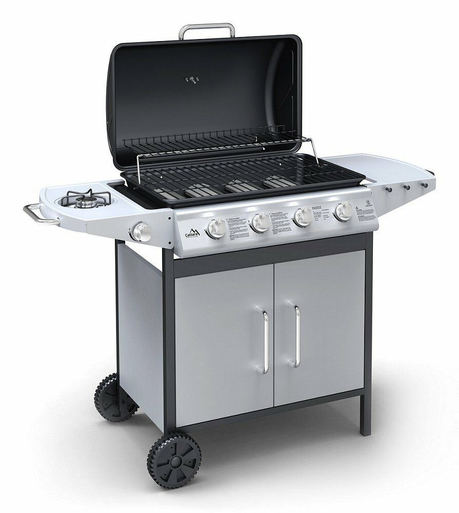 Plynový zahradní gril se systémem Flame Tamer. Hlavní grilovací prostor je osazen 4x hořákem se samostatnou regulací a piezo zapalováním a je vybaven roštem pro udržení teplých pokrmů. Díky možnosti vypnout prostřední hořáky je gril vhodný jak pro přímé, tak pro nepřímé grilování.