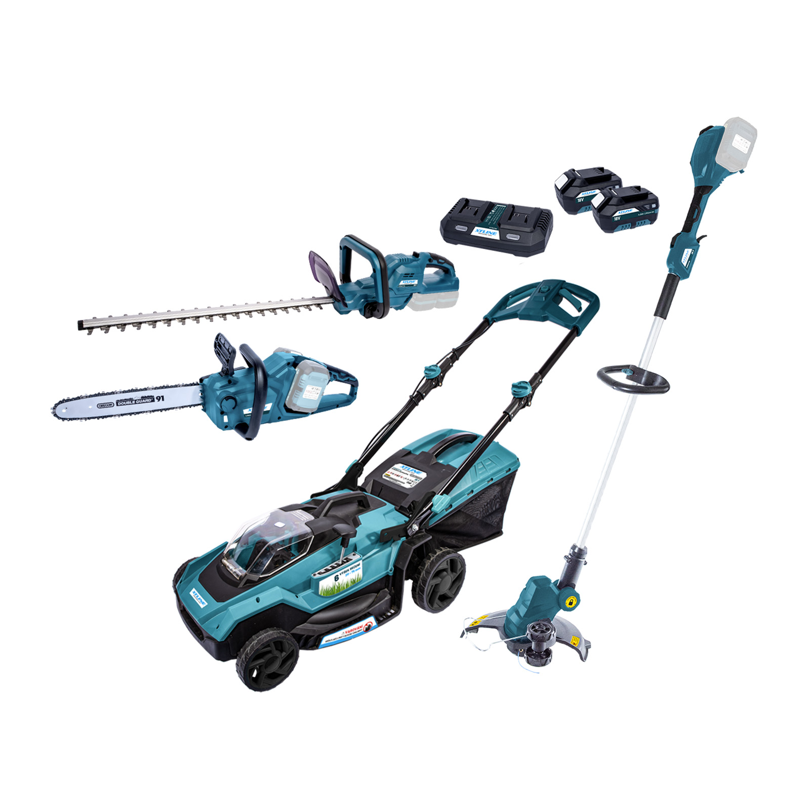 Aku zahradní set XTLINE obsahuje aku sekačku, strunovou sekačku, nůžky na živý plot, řetězovou pilu, 2x baterii 18 V 4.0 Ah a dvounabíječku baterií. Všechna zařízení jsou vybavena protiskluzovým měkkým držadlem pro ergonomickou a bezpečnou manipulaci. Systém akumulátoru XTLINE poskytne dostatek energie pro celou řadu akumulátorového nářadí XTLINE. Jednou baterií totiž můžete pohánět všechny produkty setu.