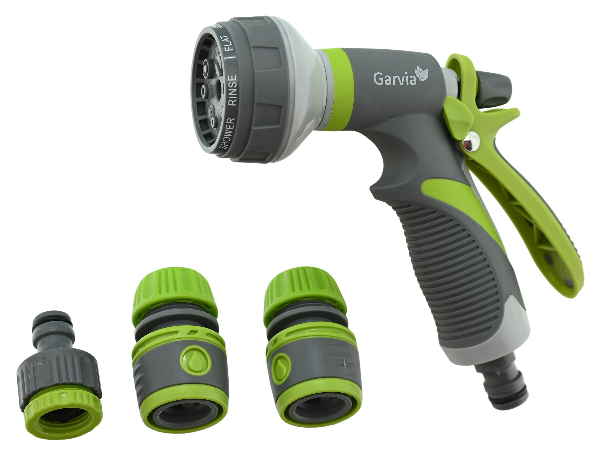 Sada obsahuje kruhovou zvlažovací pistoli s nastavitelnými režimy zavlažování otáčením čelní části (plný oplach, kuželový postřik, silný proud, středový postřik, vodní mlha, sprcha, smáčení, plochý postřik). Rukojeť je opatřena spouští, díky které lze individuálně dávkovat vodu, bez plýtvání. Zároveň je možné zajistit, použitím západky, nepřetržitý průtok. Průtok samotný lze regulovat otočným prvkem na spoušti. Pistole je opatřena CLICK adaptérem, který umožňuje rychlé připojení jednoduchým nacvaknutím k hadici opatřené CLICK rychlospojkou.