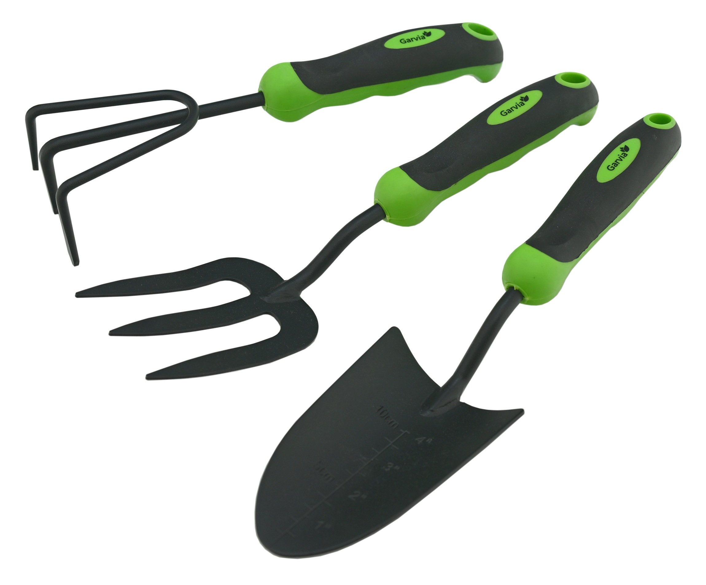 Lopatka je opatřena lžící s rozměry 14,5 x 8 cm (celkové rozměry 34 x 8 cm) a je doplněná hloubkoměrem (cm / palce), je tak vhodná zejména pro výsadbu, ale i další zahradní činnosti. Kultivátor s rozměry 28 x 8 cm je určený ke kypření půdy, provzdušnění zeminy, ale i odstranění plevele. Hrabičky s rozměry 32 x 7,5 cm jsou ideální pro úpravu záhonů, rozhrnutí půdy a sběr rostlinného odpadu.